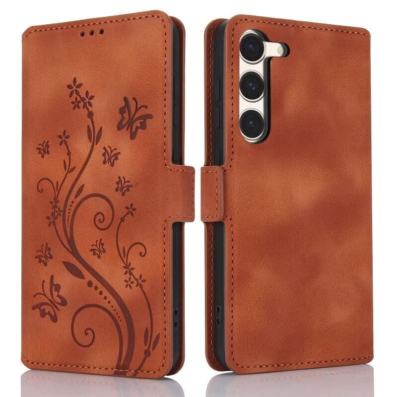 Θήκη τηλεφώνου Samsung Galaxy S23 5G με ανάγλυφο σχέδιο πεταλούδας, λουλουδιών και δέρμα (Χρυσό ροζ)