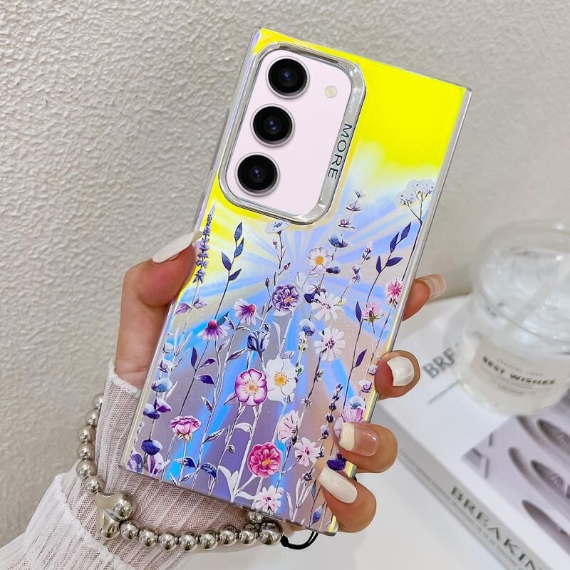 Θήκη τηλεφώνου για Samsung Galaxy S23+ 5G με ηλεκτρολυτική επίστρωση, λουλούδι λέιζερ και λουρί καρπού (Λουλούδι AH1)