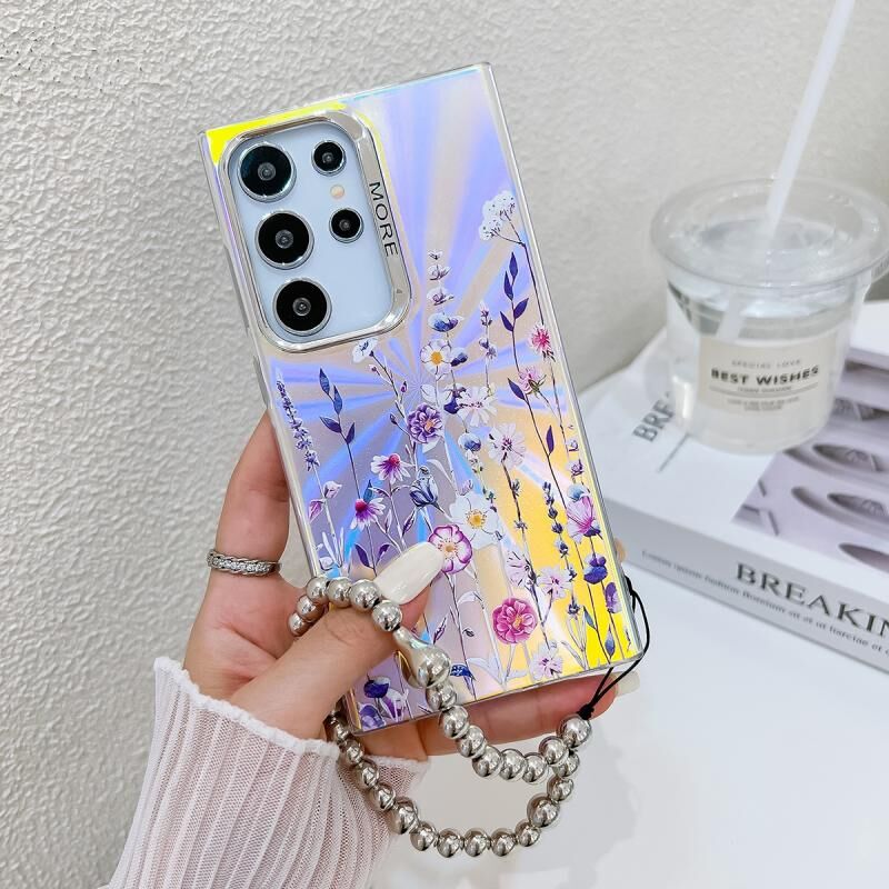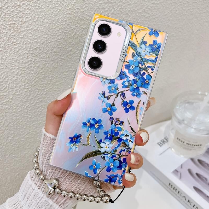 Θήκη τηλεφώνου για Samsung Galaxy S23+ 5G με ηλεκτρολυτική επίστρωση, λουλούδι λέιζερ και λουρί καρπού (Myosotis AH2)