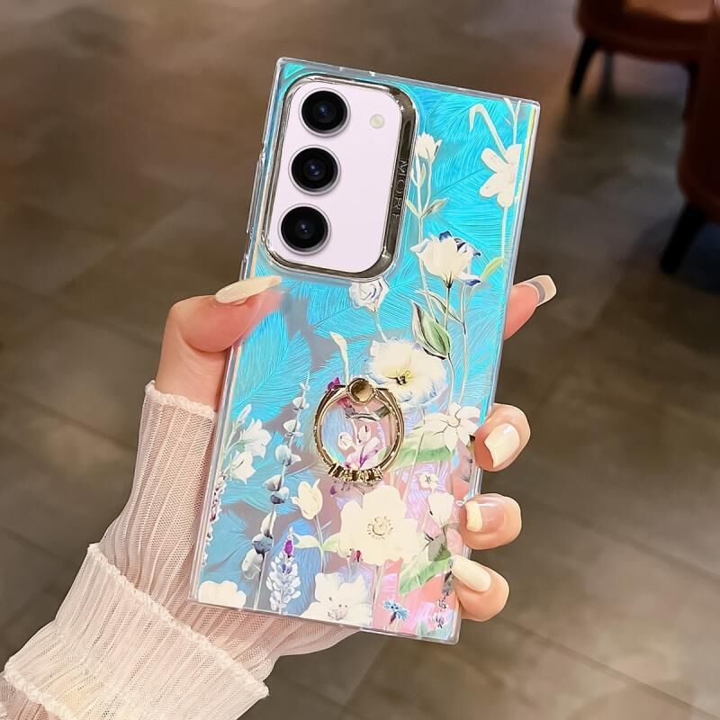 Θήκη κινητού τηλεφώνου Samsung Galaxy S23+ 5G TPU με δακτύλιο στήριξης και σχέδιο λουλουδιού με λέιζερ και ηλεκτρολυτική επικάλυψη (Λευκό Λουλούδι AH10)
