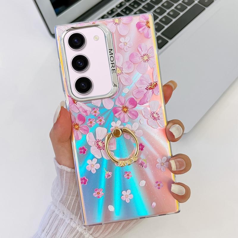 For Samsung Galaxy S23+ 5G Electroplating Laser Flower Ring Holder TPU Phone Case(Pink Flower AH13)