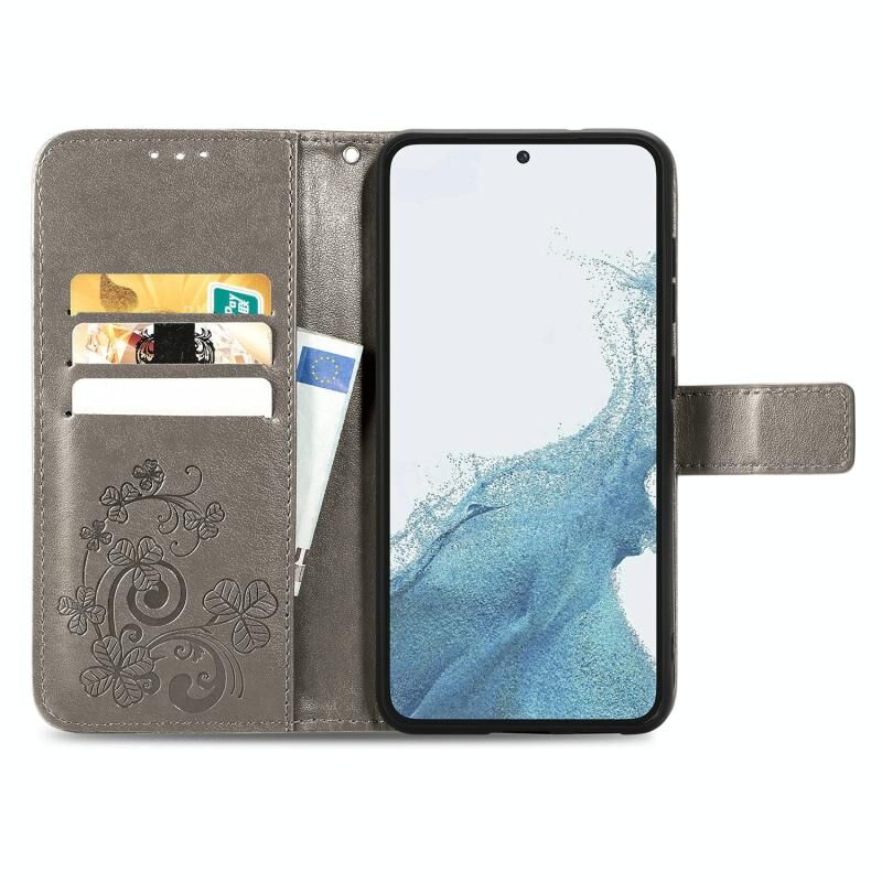 Για Samsung Galaxy S23+ 5G Four-leaf κούμπωμα ανάγλυφη αγκράφα δερμάτινη θήκη τηλεφώνου (γκρι)