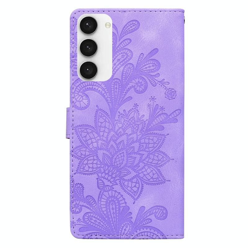 Θήκη κινητού τηλεφώνου Samsung Galaxy S23+ 5G από PU με δαντελένιο λουλουδάτο ανάγλυφο, μαγνητικό κούμπωμα και λουρί καρπού (Μωβ)