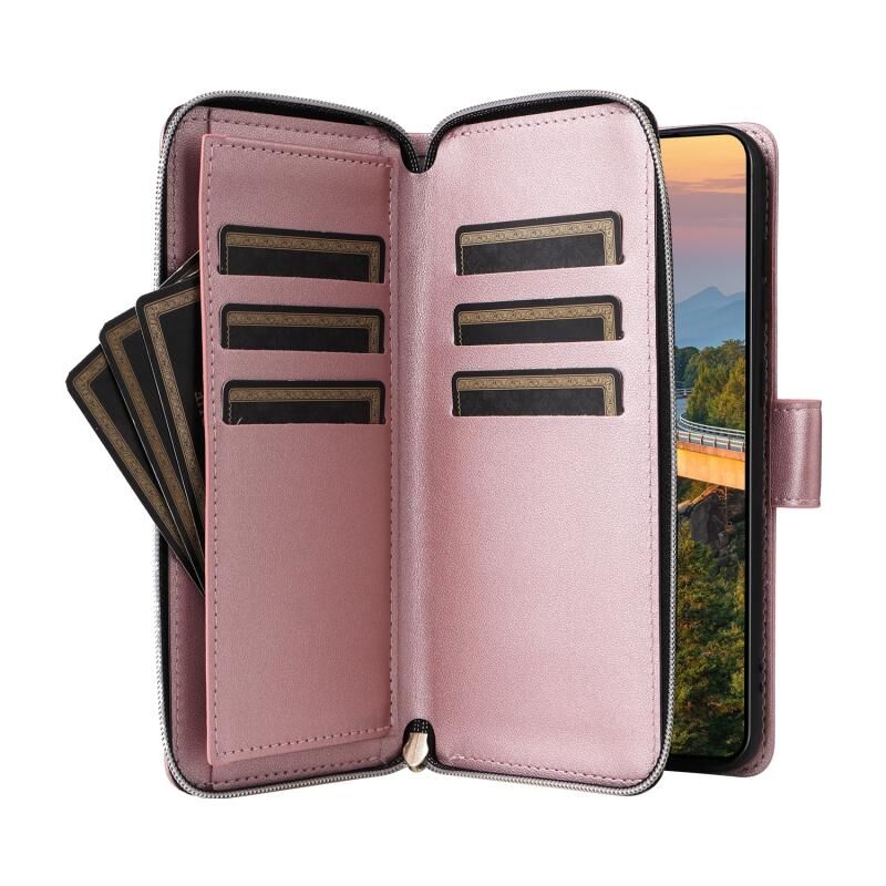 Για Samsung Galaxy S23 + 5G εννέα-κάρτα Slots φερμουάρ πορτοφόλι τσάντα δερμάτινη θήκη τηλεφώνου (Rose Gold)