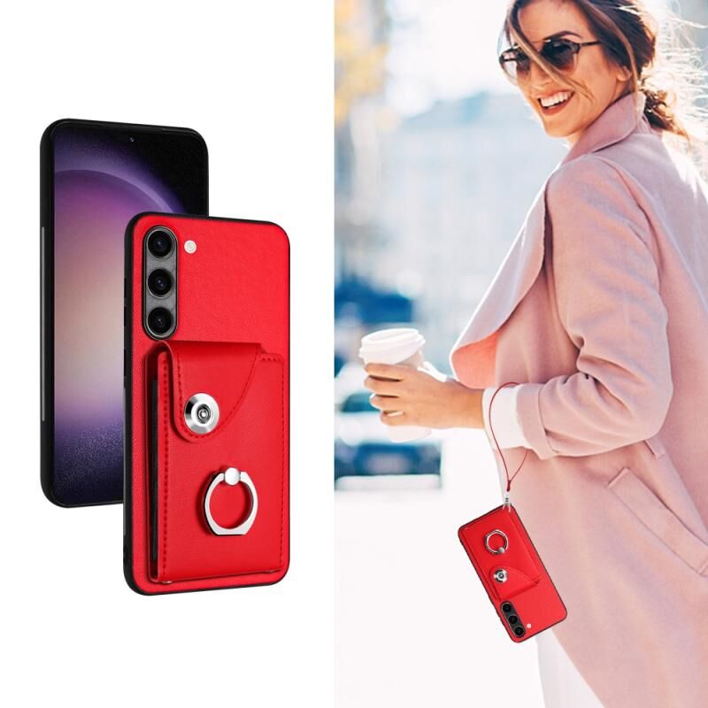 Για Samsung Galaxy S23+ 5G Οργανική κάρτα τσάντα τσάντα δαχτυλίδι κάτοχος PU υπόθεση τηλεφώνου με κορδόνι (κόκκινο)