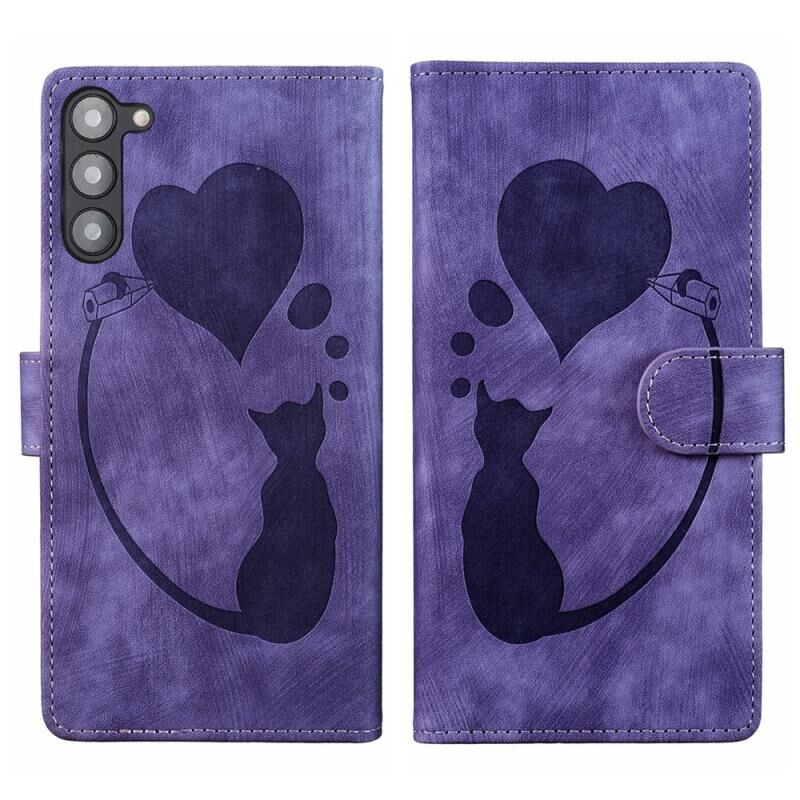 Θήκη τηλεφώνου Samsung Galaxy S23 5G με σχέδιο καρδιάς και γάτας, ανάγλυφη δερμάτινη (Μωβ)