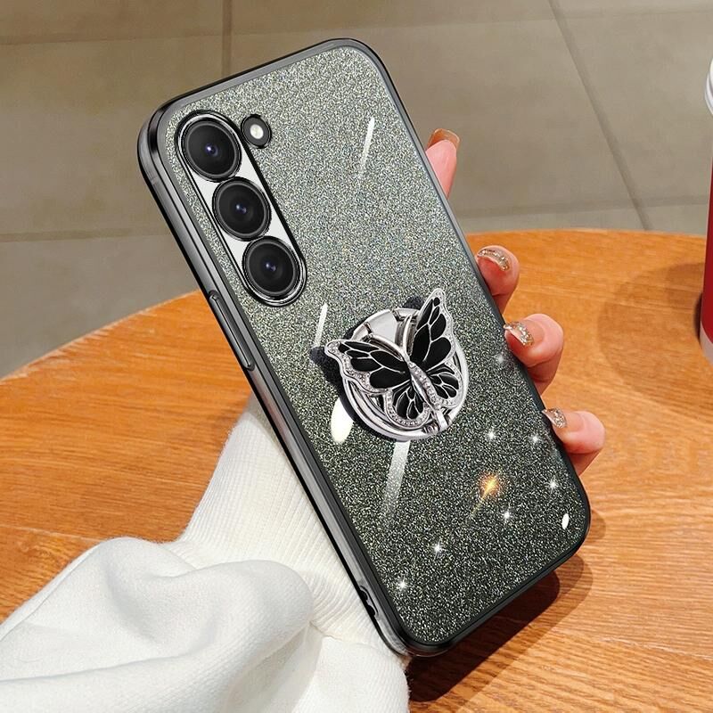 Για Samsung Galaxy S23 + 5G Επιμεταλλωμένο βαθμιδωτή Glitter πεταλούδα κάτοχος TPU υπόθεση τηλεφώνου (μαύρο)