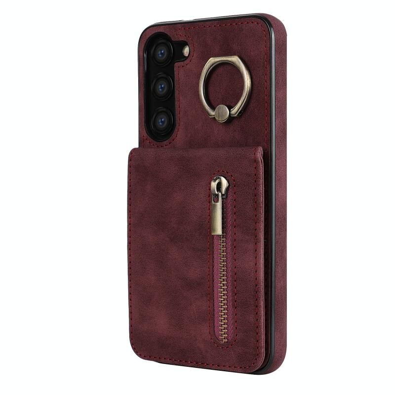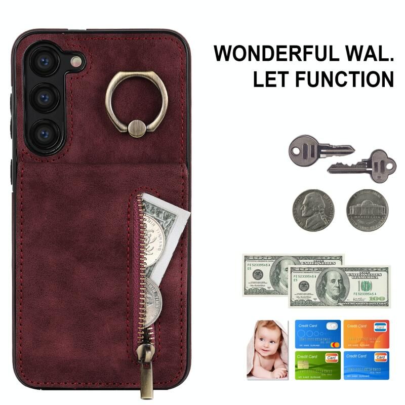 Θήκη κινητού τηλεφώνου Samsung Galaxy S23+ 5G με ρετρό δακτύλιο και θήκη καρτών RFID με φερμουάρ (Καφέ)