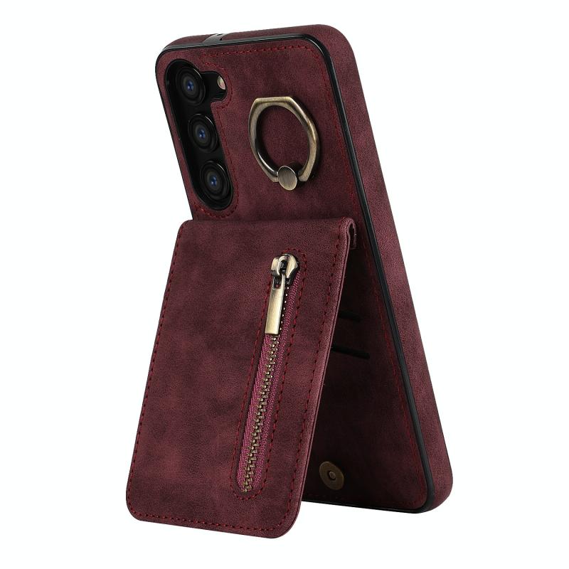 Θήκη κινητού τηλεφώνου Samsung Galaxy S23 5G με ρετρό δακτύλιο και θήκη καρτών RFID με φερμουάρ (Καφέ)