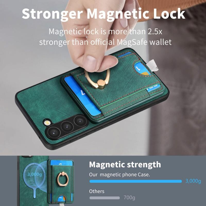 5. Το δερμάτινο πορτοφόλι διαθέτει ισχυρούς ενσωματωμένους μαγνήτες που του επιτρέπουν να κουμπώνει αβίαστα στη θέση του στο πίσω μέρος του τηλεφώνου σας, εύκολο στη χρήση και την αφαίρεση.