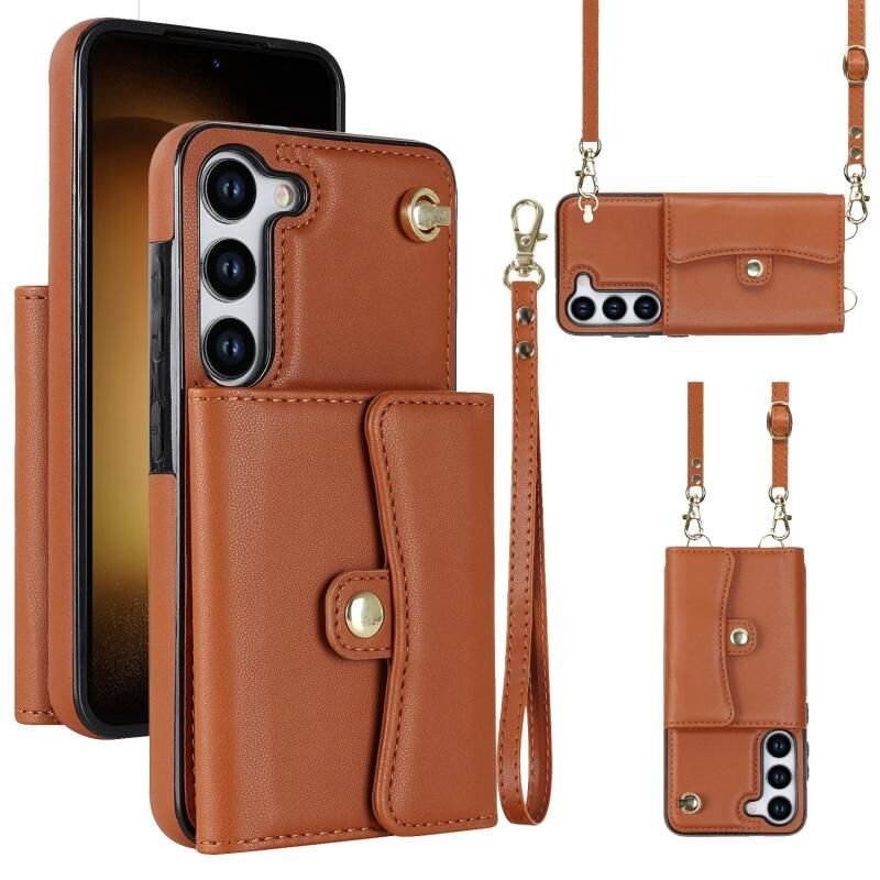 Για Samsung Galaxy S23 5G RFID Slot κάρτα δερμάτινη θήκη τηλεφώνου με μακρύ κορδόνι (καφέ)