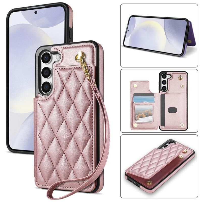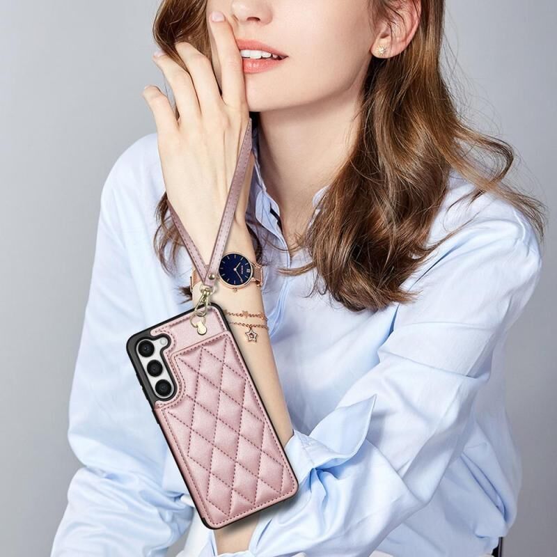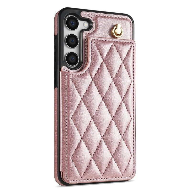 Για το Samsung Galaxy S23 5G Rhombic Διπλή Πόρπη υποδοχές κάρτας υπόθεση τηλεφώνου με κορδόνι (Rose Gold)