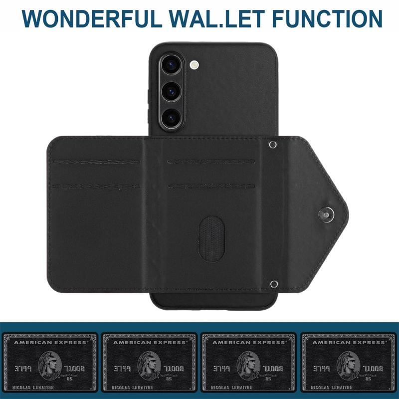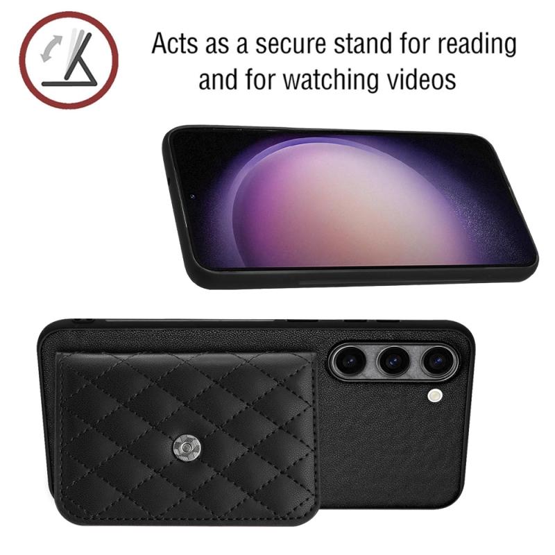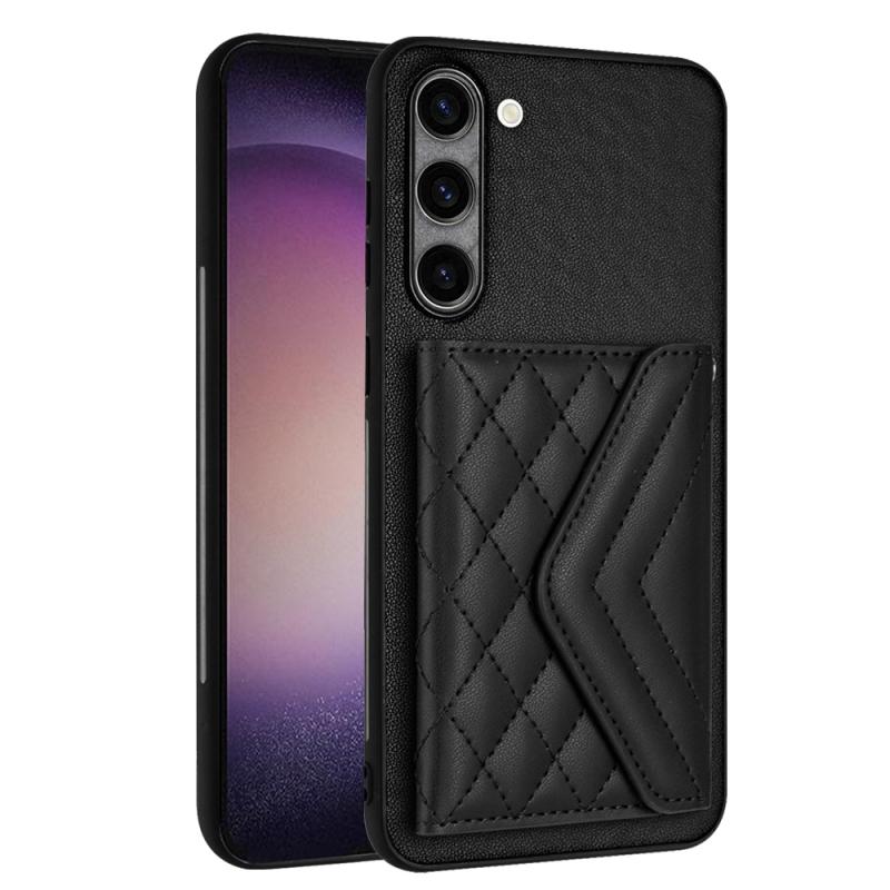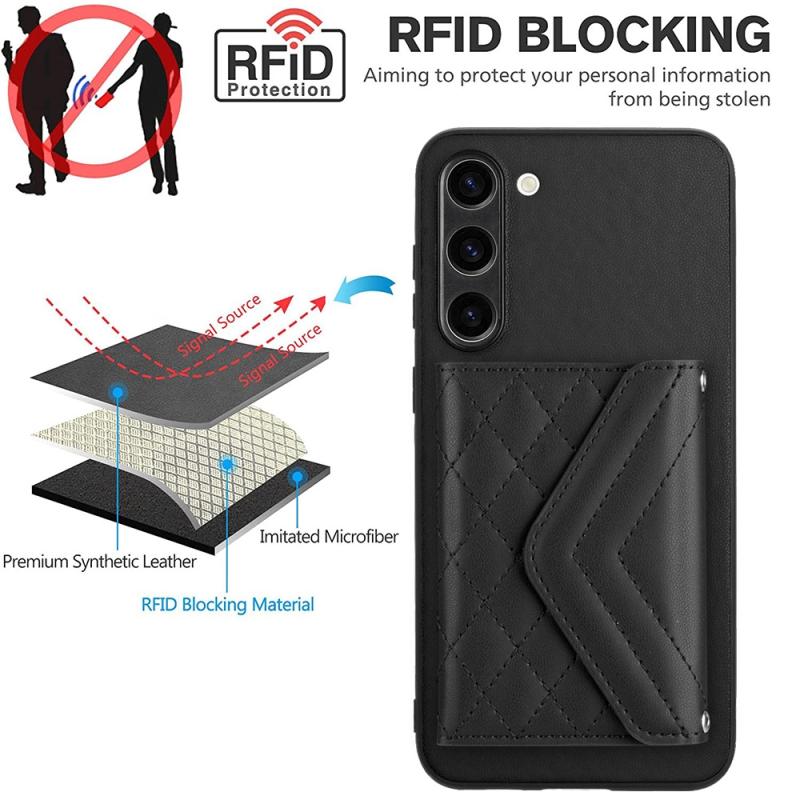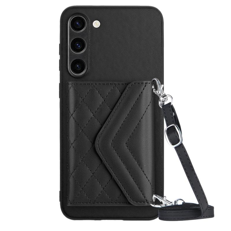 For Samsung Galaxy S23+ 5G Rhombic Texture Card Bag RFID Phone Case with Long Lanyard(Black)