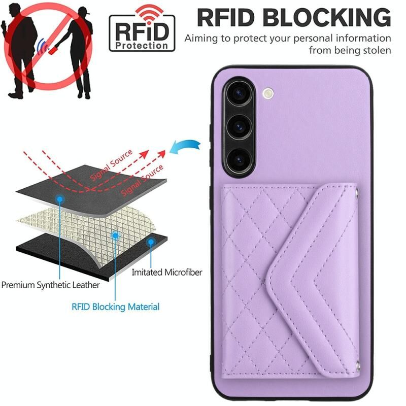 Για Samsung Galaxy S23 5G Rhombic υφή κάρτα τσάντα RFID υπόθεση τηλεφώνου με μακρύ κορδόνι (Light Purple)