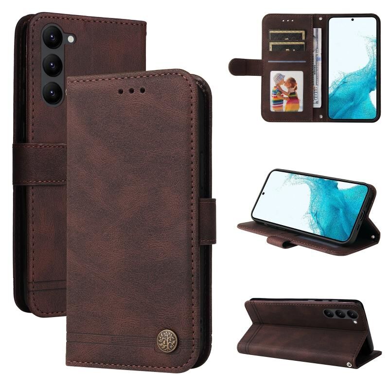Θήκη κινητού Samsung Galaxy S23 5G με μεταλλικά κουμπιά και δέρμα, αίσθηση ζωής, σχέδιο Δέντρου (Μπλε)