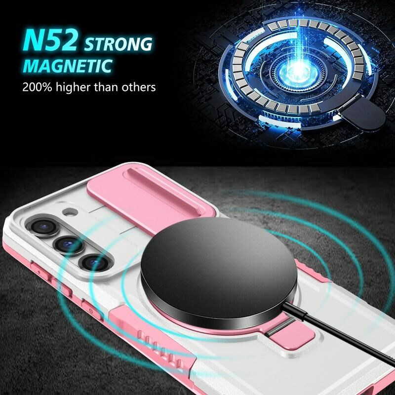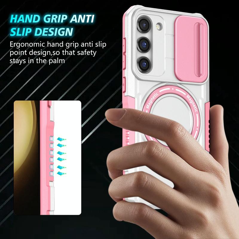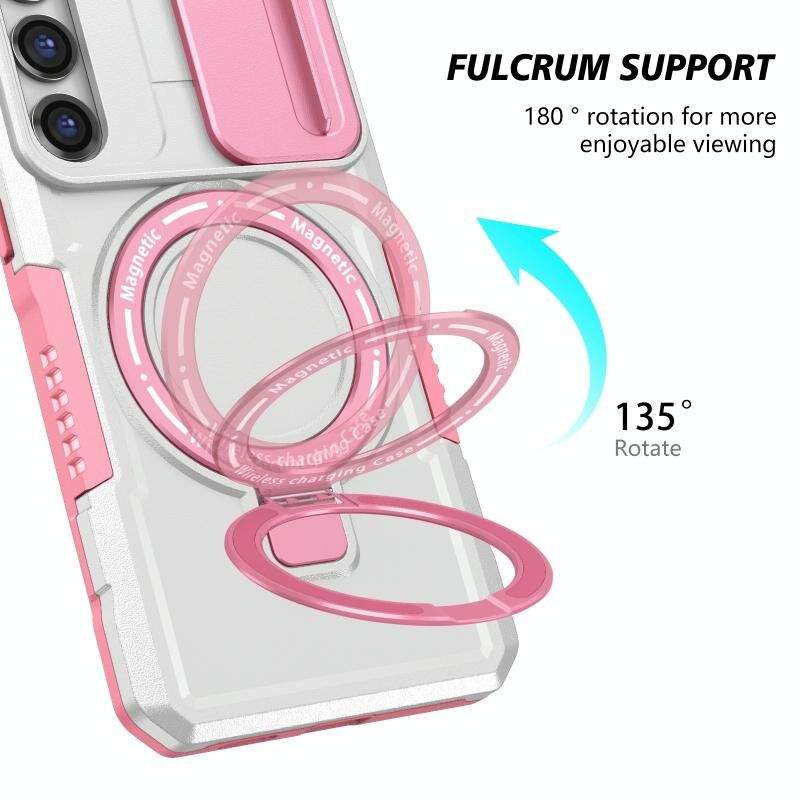 For Samsung Galaxy S23+ 5G Sliding Camshield Magsafe Holder TPU Hybrid PC Phone Case(Pink White)