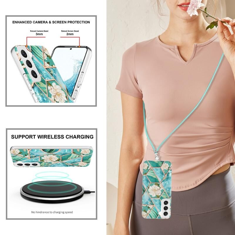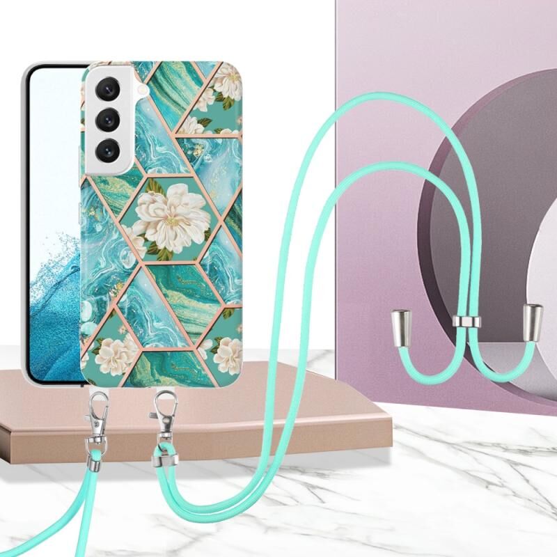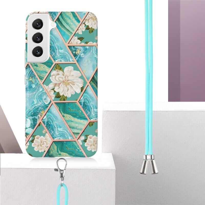 For Samsung Galaxy S23 5G Splicing Marble Flower IMD TPU Phone Case with Lanyard(Blue Flower)