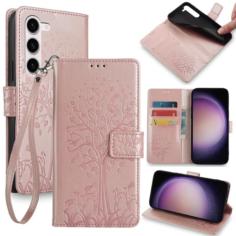 Για Samsung Galaxy S23 5G δέντρο & ελάφι ανάγλυφη δερμάτινη θήκη τηλεφώνου (ροζ χρυσό)