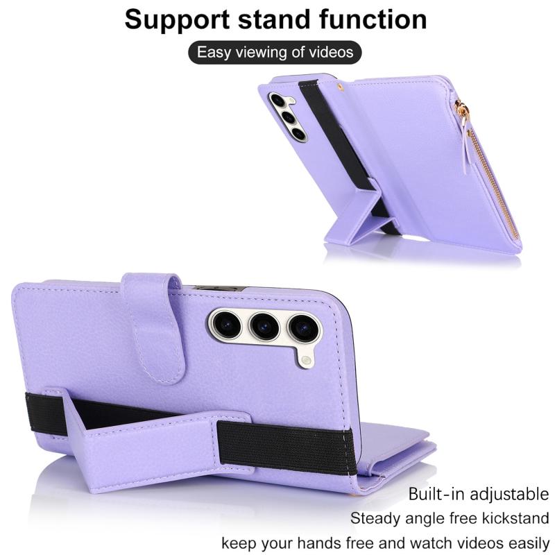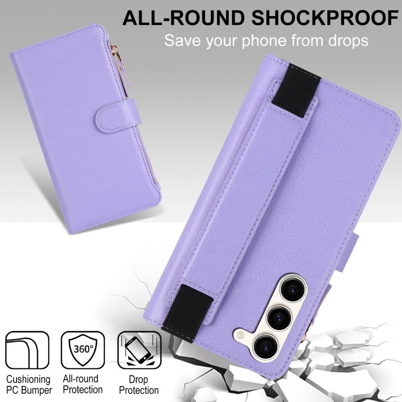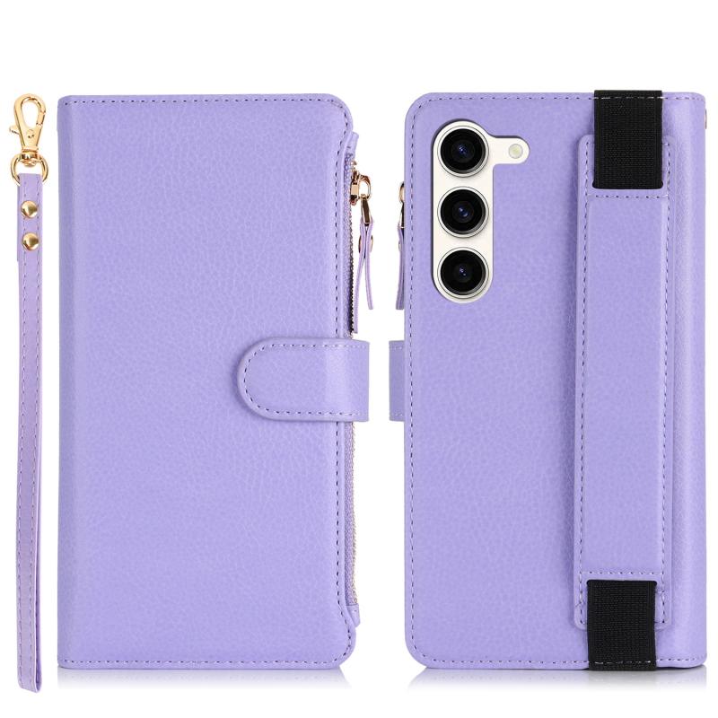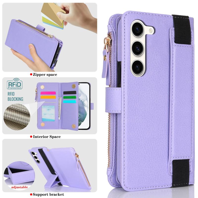 For Samsung Galaxy S23 5G Wristband Holder Zipper Purse RFID Leather Phone Case(Purple)