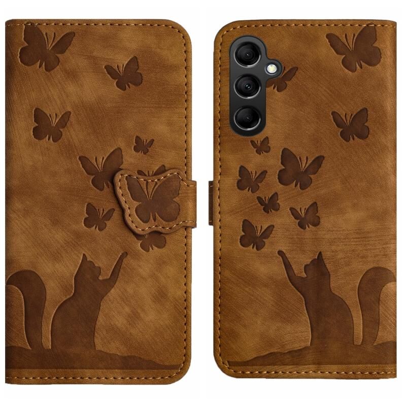 Θήκη τηλεφώνου Samsung Galaxy S23 FE 5G, δερμάτινη, τύπου flip, με ανάγλυφο σχέδιο πεταλούδας και γάτας (Καφέ)
