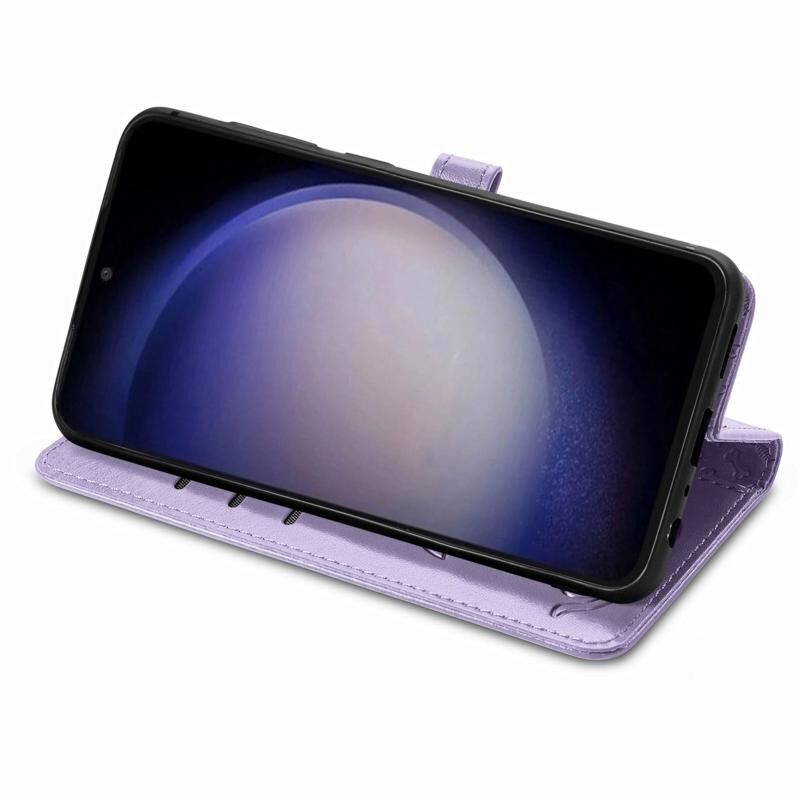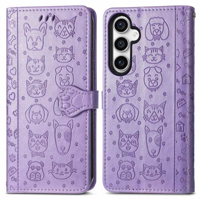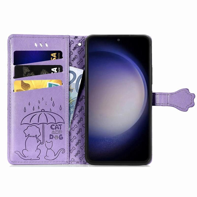 Θήκη τηλεφώνου Samsung Galaxy S23 FE 5G από δέρμα με ανάγλυφο σχέδιο γάτας και σκύλου (Μωβ)