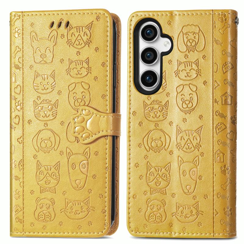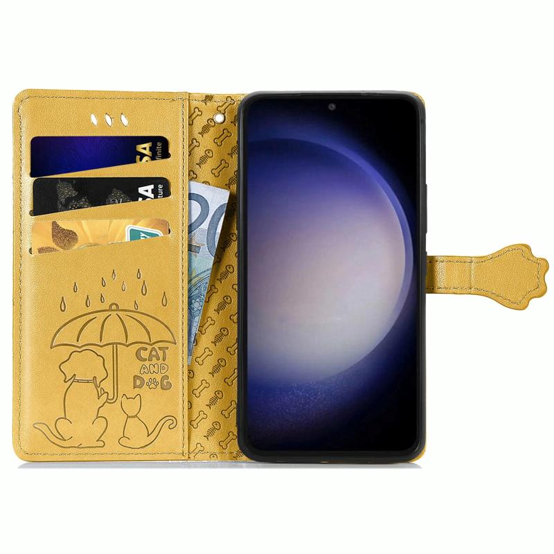 For Samsung Galaxy S23 FE 5G Cat and Dog Embossed Leather Phone Case(Yellow)