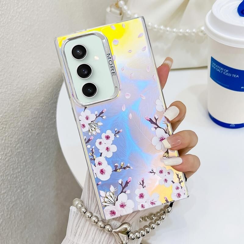 Θήκη τηλεφώνου για Samsung Galaxy S23 FE 5G με ηλεκτρολυτική επίστρωση, λουλουδάτο σχέδιο λέιζερ και λουρί καρπού (Δαμασκηνιά AH18)