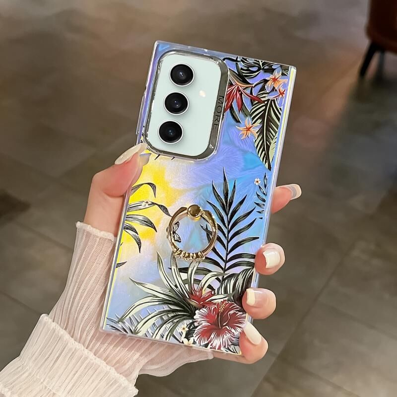 Θήκη κινητού τηλεφώνου Samsung Galaxy S23 FE 5G TPU με δακτύλιο στήριξης και σχέδιο λουλουδιών με λέιζερ και ηλεκτρολυτική επικάλυψη (Φύλλα AH12)