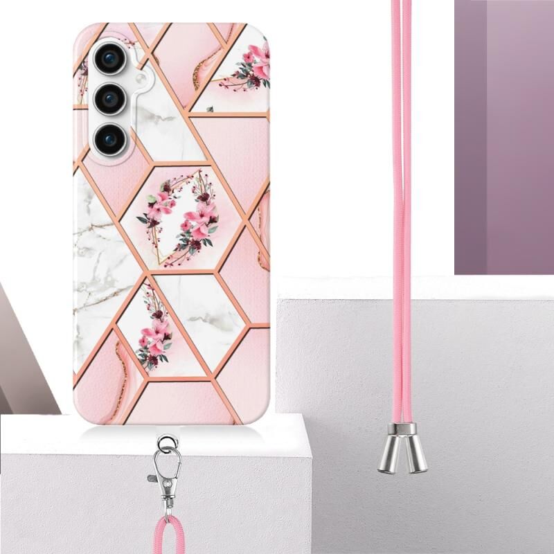 Θήκη κινητού τηλεφώνου Samsung Galaxy S23 FE 5G με επιμετάλλωση, συνδυασμό μαρμάρου, λουλούδι IMD TPU με κορδόνι (Μαύρο Λουλούδι)