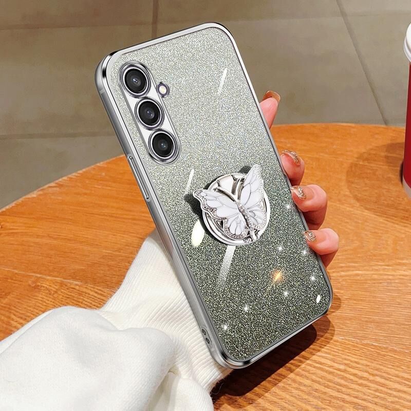 Για Samsung Galaxy S23 FE 5G Επιμεταλλωμένο βαθμιδωτή Glitter πεταλούδα κάτοχος TPU υπόθεση τηλεφώνου (ασημί)