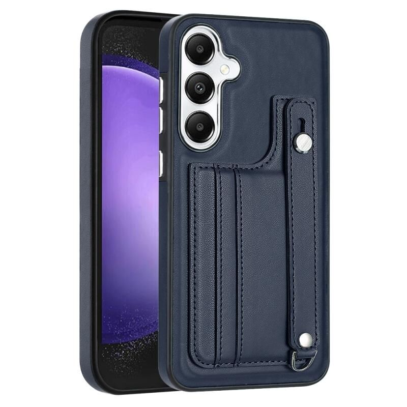 Για Samsung Galaxy S23 FE 5G Αντικραδασμική δερμάτινη θήκη τηλεφώνου με λουράκι καρπού (μπλε)