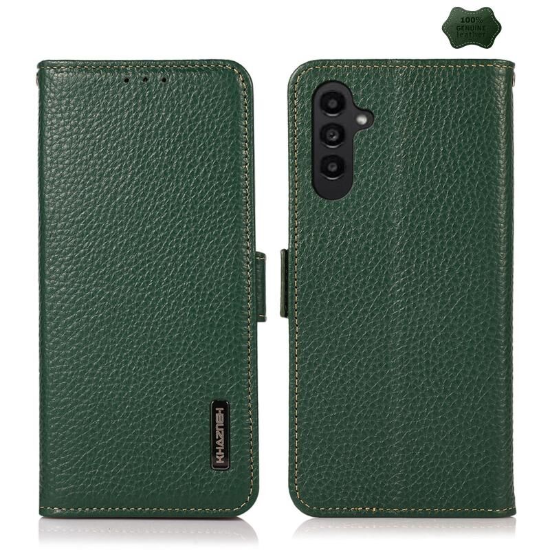Θήκη κινητού τηλεφώνου Samsung Galaxy S23 FE KHAZNEH με μαγνητικό κλείσιμο, από γνήσιο δέρμα Litchi και προστασία RFID (πράσινο)