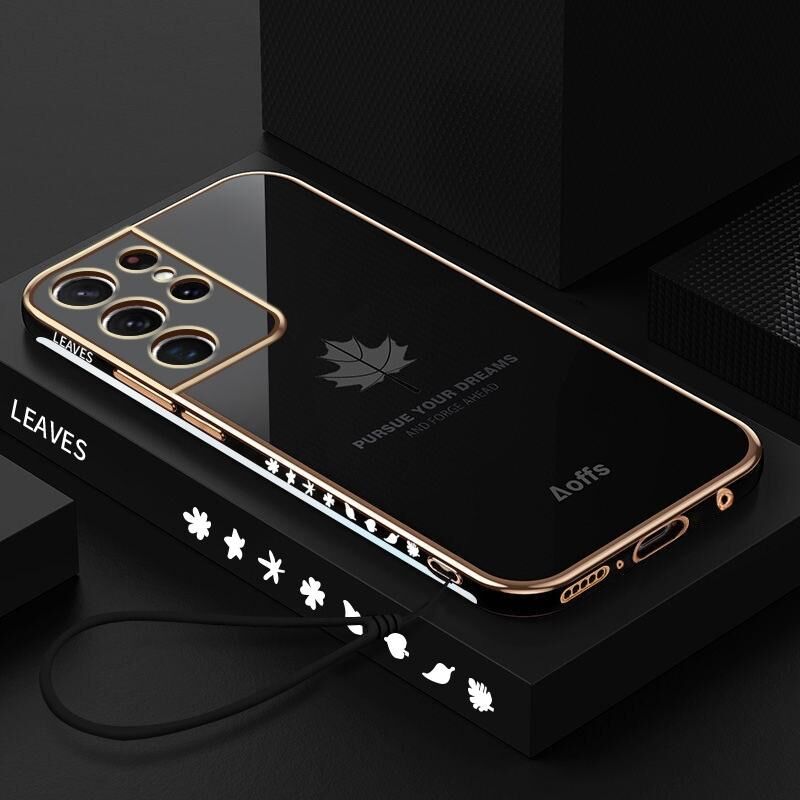 For Samsung Galaxy S23 Ultra 5G 9D Plating Maple Leaf Silicone Phone Case with Strap(Black)