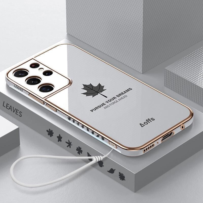 For Samsung Galaxy S23 Ultra 5G 9D Plating Maple Leaf Silicone Phone Case with Strap(White)