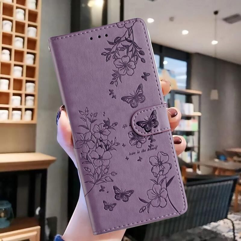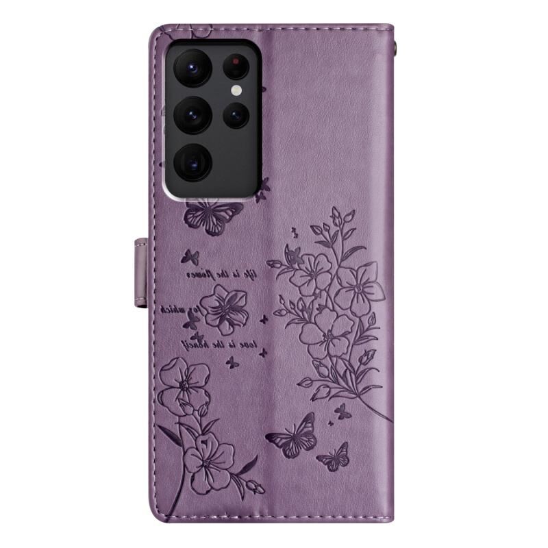 Θήκη τηλεφώνου Samsung Galaxy S23 Ultra 5G από δέρμα με πεταλούδες και λουλούδια (Μωβ)