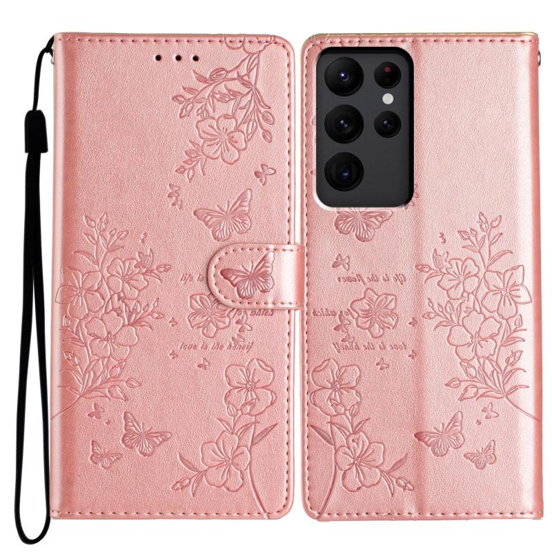 For Samsung Galaxy S23 Ultra 5G Butterflies and Flowers Leather Phone Case(Rose Gold)