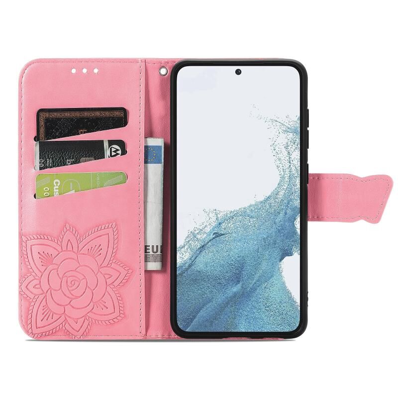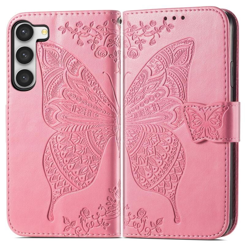 Θήκη τηλεφώνου Samsung Galaxy S23 Ultra 5G από δέρμα με ανάγλυφο σχέδιο πεταλούδας και λουλουδιών (Χρυσό ροζ)