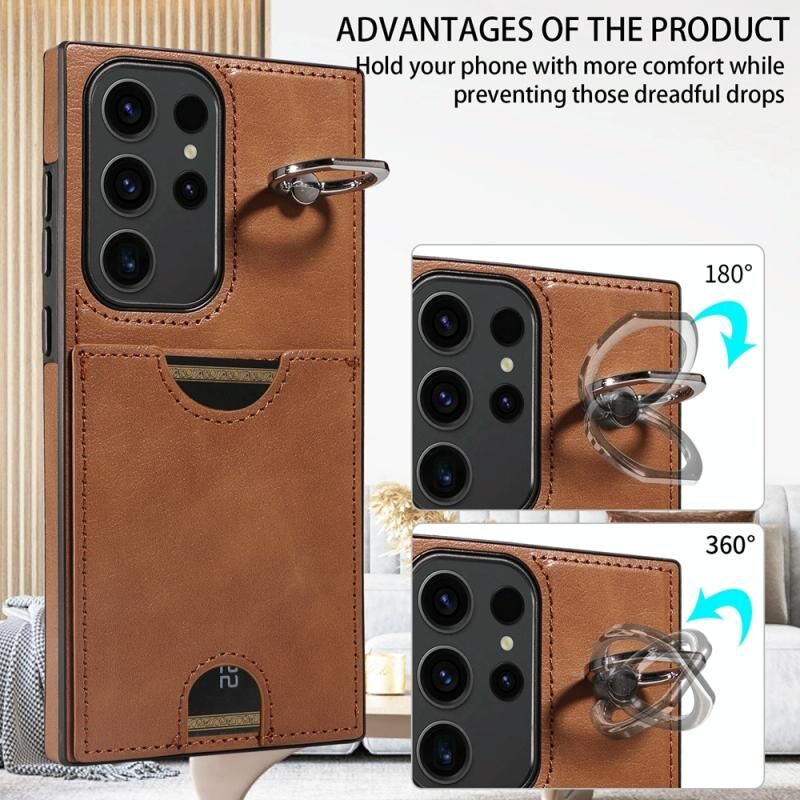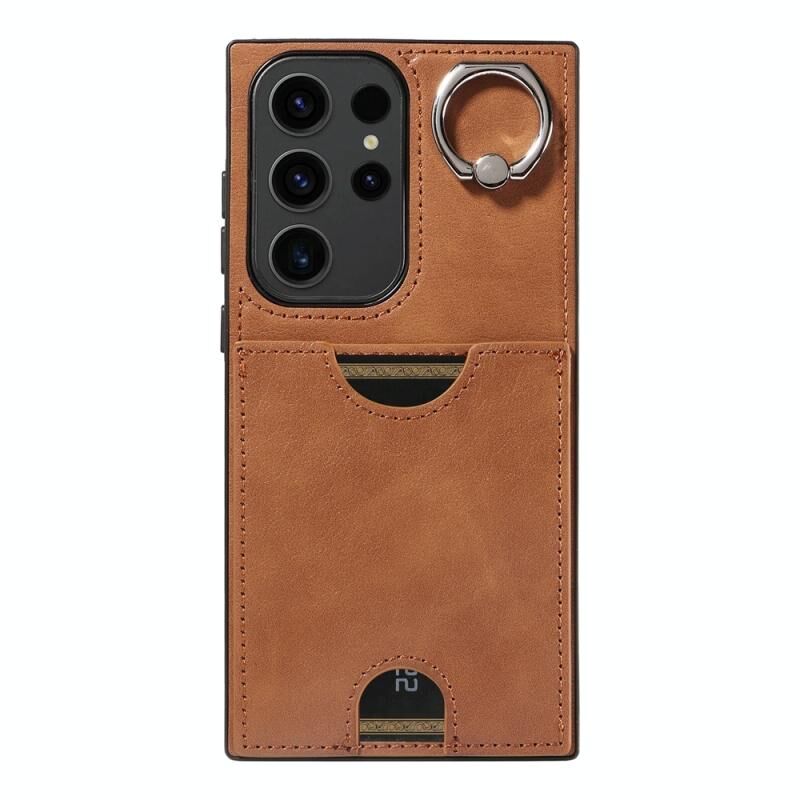 Για Samsung Galaxy S23 Ultra 5G μοσχάρι Υφή κάρτα Slot δαχτυλίδι κάτοχος υπόθεση τηλεφώνου (καφέ)