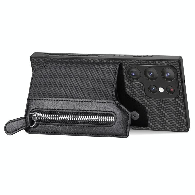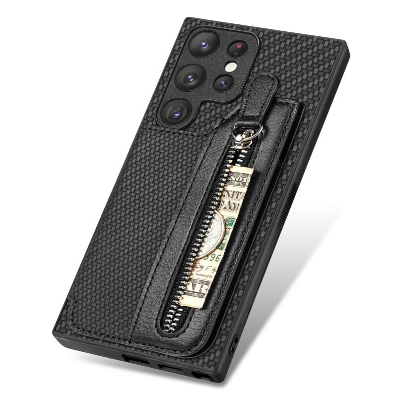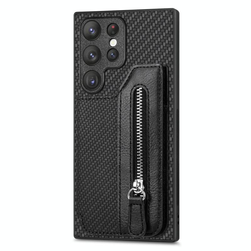 Για Samsung Galaxy S23 Ultra 5G Carbon Fiber Flip φερμουάρ Wallet υπόθεση τηλεφώνου (Μαύρο)