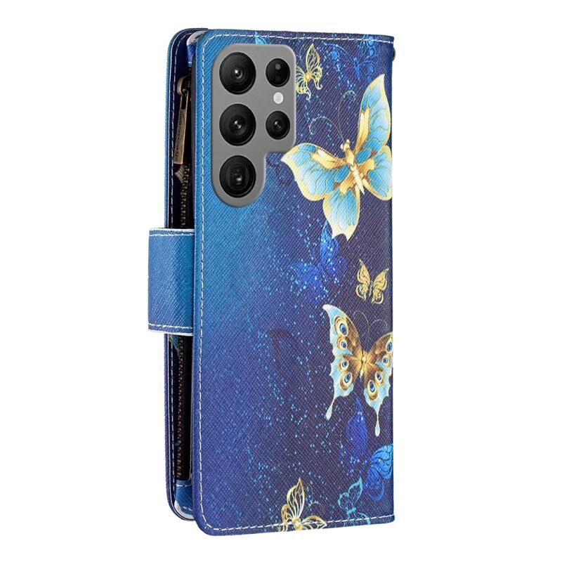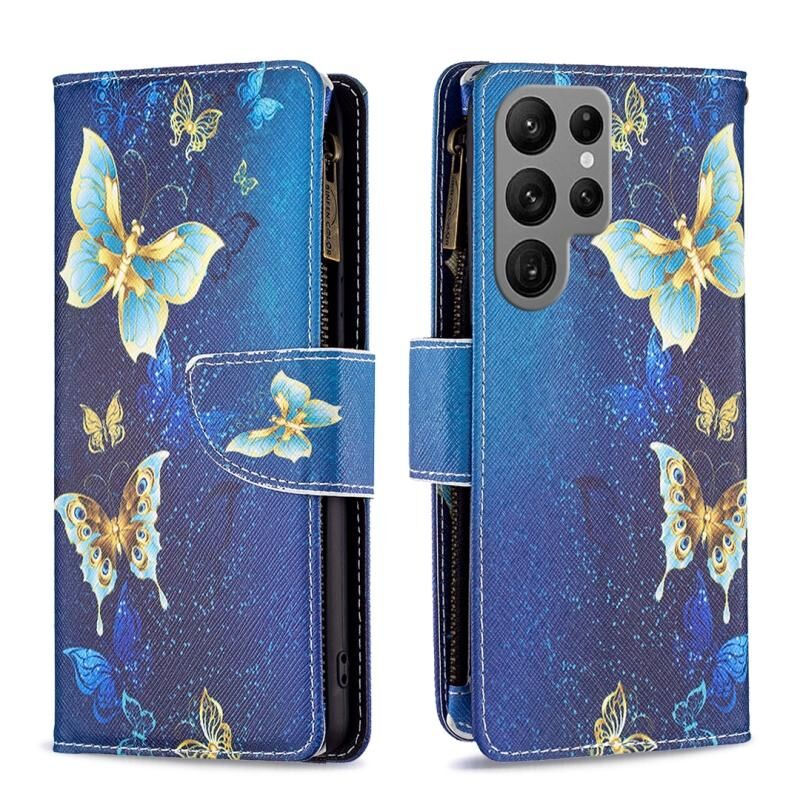 Θήκη τηλεφώνου Samsung Galaxy S23 Ultra 5G από δέρμα με φερμουάρ και σχέδιο ζωγραφικής σε χρώμα (Μωβ Πεταλούδα)