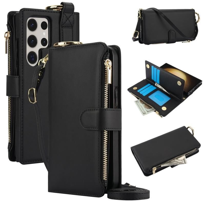 Για Samsung Galaxy S23 Ultra 5G Crossbody Ring Πολυλειτουργική θήκη τηλεφώνου δερμάτινο πορτοφόλι (Μαύρο)