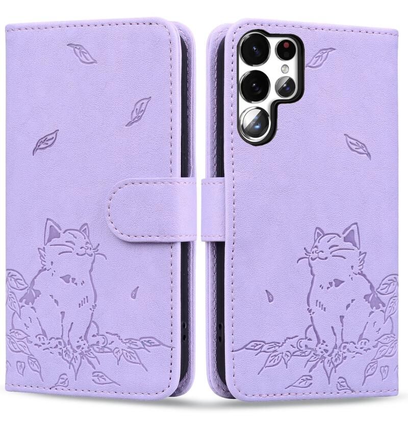 Θήκη τηλεφώνου δερμάτινη ανάγλυφη με χαριτωμένη γάτα για Samsung Galaxy S23 Ultra 5G (Γαλάζιο του ουρανού)