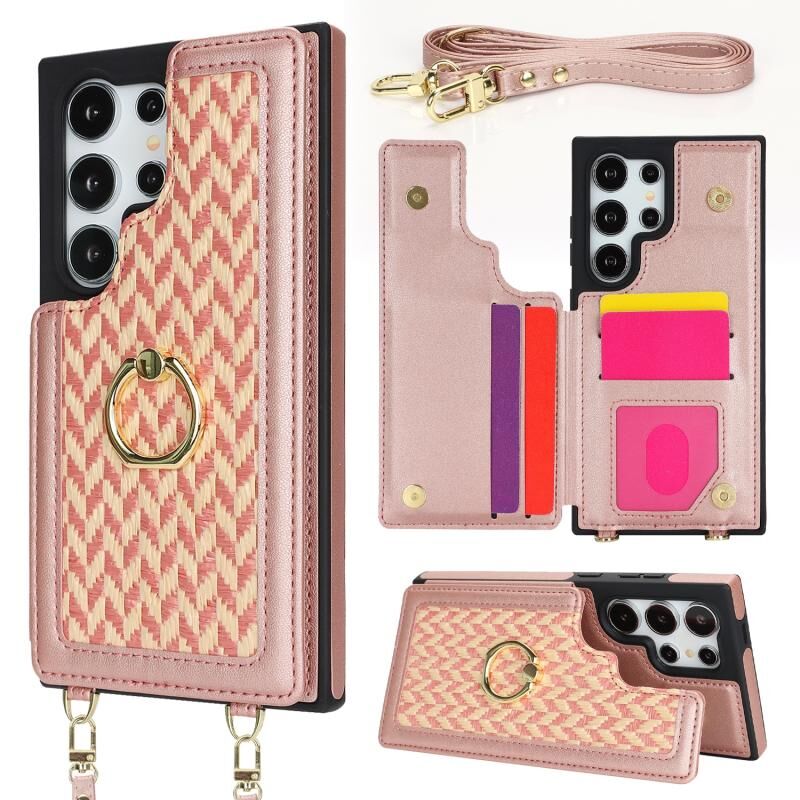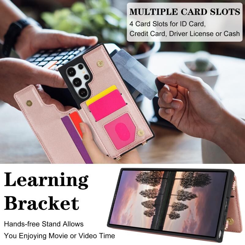 Για Samsung Galaxy S23 Ultra 5G Double Bckle Slot κάρτα πλήρους κάλυψης υπόθεση τηλεφώνου με λουράκι σταυρού σώματος (Rose Gold)