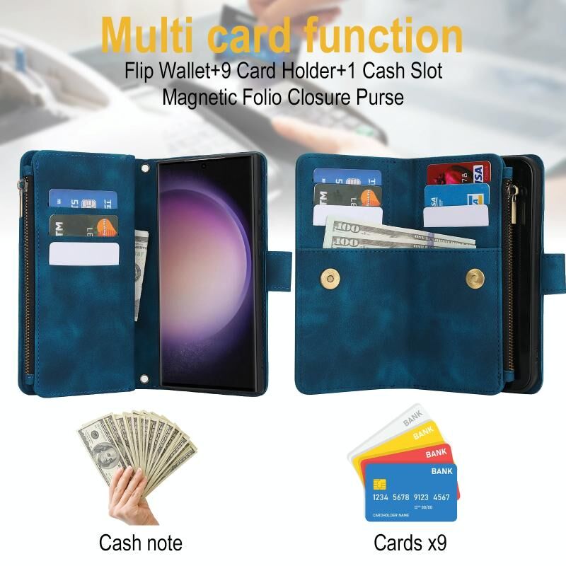 2. Λειτουργία πορτοφολιού πολλαπλών καρτών: 9 υποδοχές για κάρτες και 1 θήκη μετρητών με φερμουάρ για να αποθηκεύετε τις πιστωτικές σας κάρτες, μετρητά ή μικρά χαρτονομίσματα για τις καθημερινές σας ανάγκες.