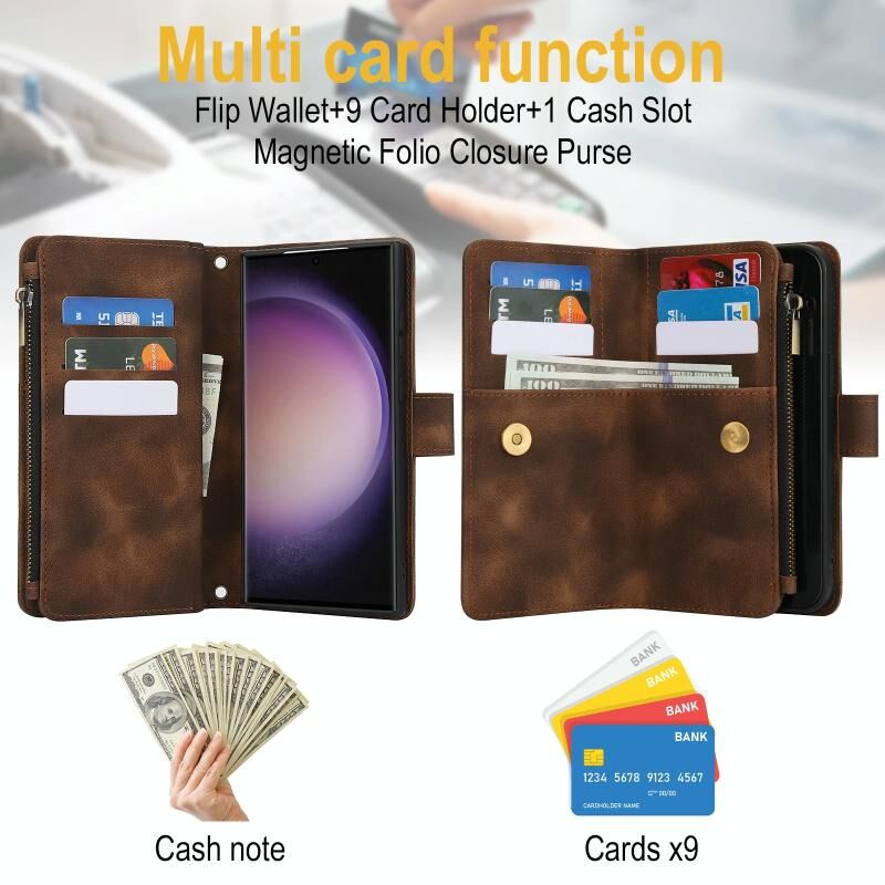 2. Λειτουργία πορτοφολιού πολλαπλών καρτών: 9 υποδοχές για κάρτες και 1 θήκη μετρητών με φερμουάρ για να αποθηκεύετε τις πιστωτικές σας κάρτες, μετρητά ή μικρά χαρτονομίσματα για τις καθημερινές σας ανάγκες.