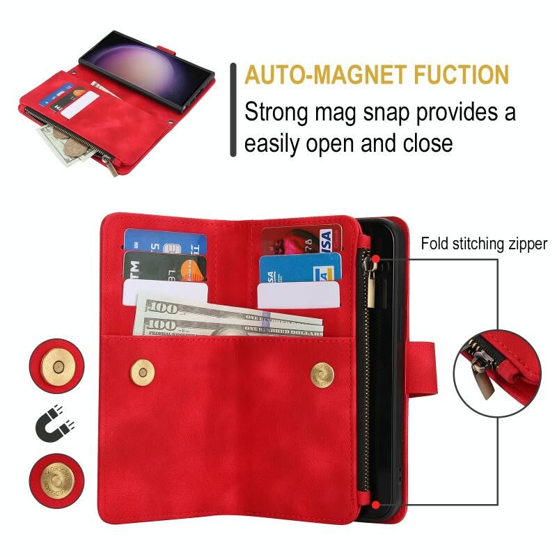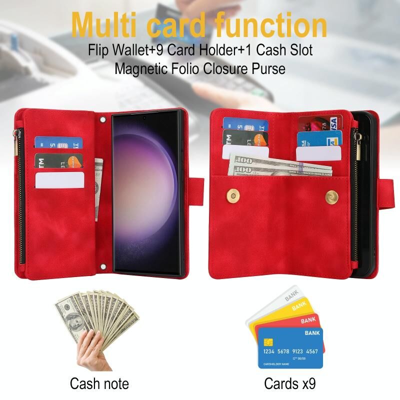 2. Λειτουργία πορτοφολιού πολλαπλών καρτών: 9 υποδοχές για κάρτες και 1 θήκη μετρητών με φερμουάρ για να αποθηκεύετε τις πιστωτικές σας κάρτες, μετρητά ή μικρά χαρτονομίσματα για τις καθημερινές σας ανάγκες.