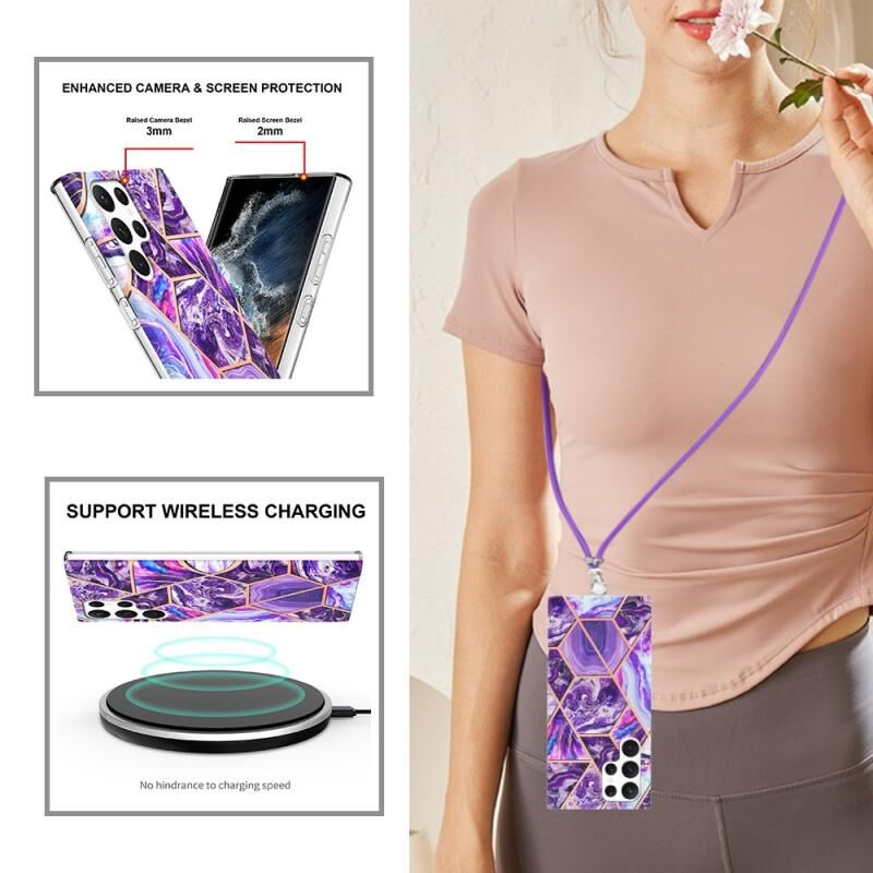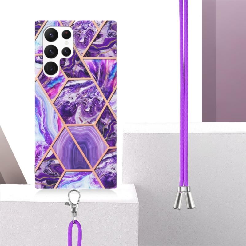 For Samsung Galaxy S23 Ultra 5G Electroplating IMD Splicing Dual-side Marble TPU Phone Case with Lanyard(Dark Purple)