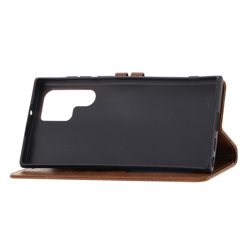 Για Samsung Galaxy S23 Ultra 5G ανάγλυφο Happy Cat μοτίβο Flip υπόθεση τηλεφώνου δέρμα (καφέ)