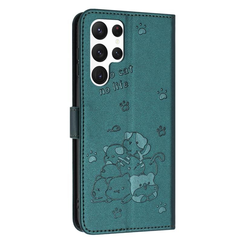 For Samsung Galaxy S23 Ultra 5G Embossed Kitten Phone Leather Case with Lanyard(Dark Green)