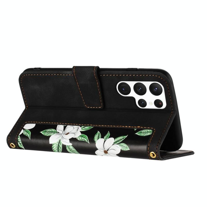 Θήκη τηλεφώνου Samsung Galaxy S23 Ultra 5G από δέρμα με λουλουδάτο σχέδιο και κορδόνι (Ανοιχτό Μπλε)